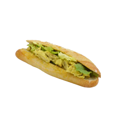 demi baguette 6 céréales, fromage à tartiner au curry, salade verte, tomate, poulet émincé de cuisse (label BBC)
